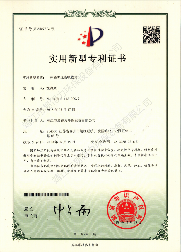 專利證書本公司坐落于開放開發(fā)超前城市江蘇靖江,我們精良優(yōu)秀設計團隊始終遵循著創(chuàng)新超越的理念,贏得了中外合資企業(yè)的信賴。易得力環(huán)保設備有限公司與上海環(huán)科院等科研單位保持合作關系,不斷加大自身的科研力量,集中了一批國內(nèi)環(huán)境科技研究和應用方面的高素質(zhì)人才,取得多項實用新型專利證書。…… 查看更多 >>